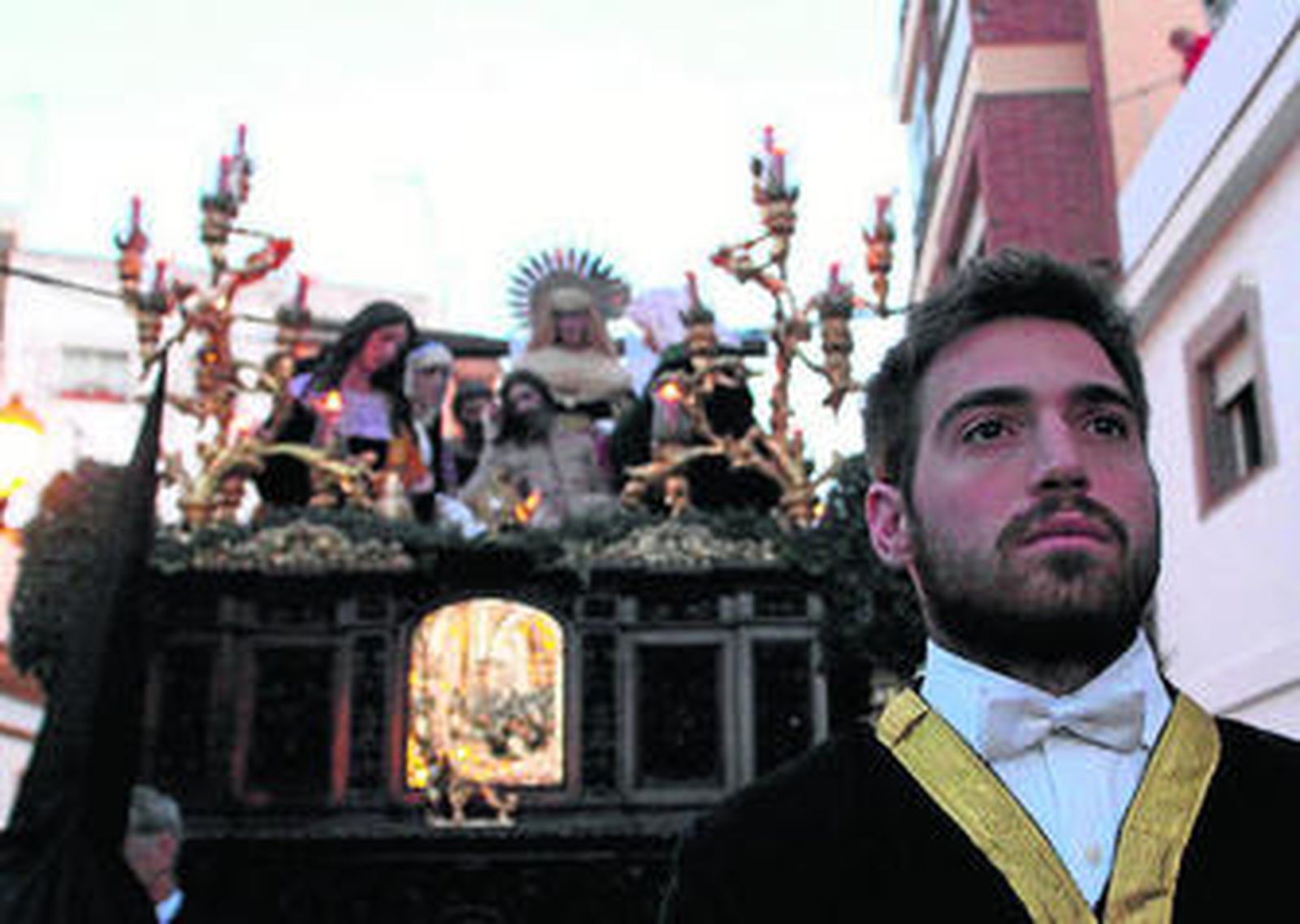 El clasicismo enmudeció a los fieles. Los 42 costaleros de la Sagrada Mortaja necesitan relevos pero no les faltan. Jóvenes fuertes vestidos de negro. Es Viernes Santo y el luto recorre el centro de Algeciras.