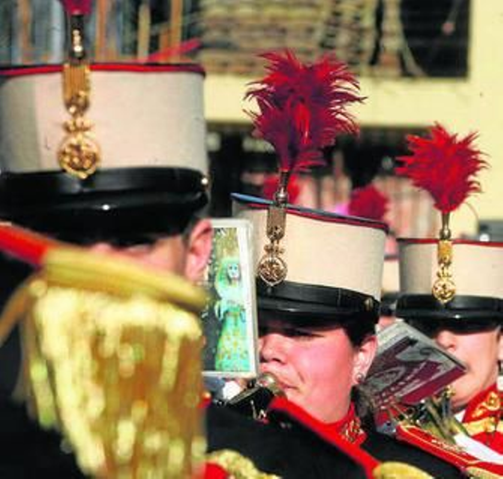 A las seis de la tarde, tras abrirse la puerta de la parroquia de la Santísima Trinidad, la cruz de guía anunció el cortejo que invadió de azul y blanco la plaza, en la que la gente aguantaba a pleno sol la espera, con una temperatura bastante más cálida que la que se anunciaba para las siguientes horas. Las miradas emocionadas de los fieles y, en el caso de quienes estaban junto a la puerta del templo, se centraron, a veces sin respirar, en ver el gran esfuerzo de la cuadrilla de costaleros que, de rodillas, sacaban el paso de Misterio para salvar el marco de la puerta. Algunos ayudaban desde fuera de la canastilla, pues en ese momento no caben todos. Es un conjunto escultórico realizado en 1999 en los talleres sevillanos de Lourdes Hernández Peña.