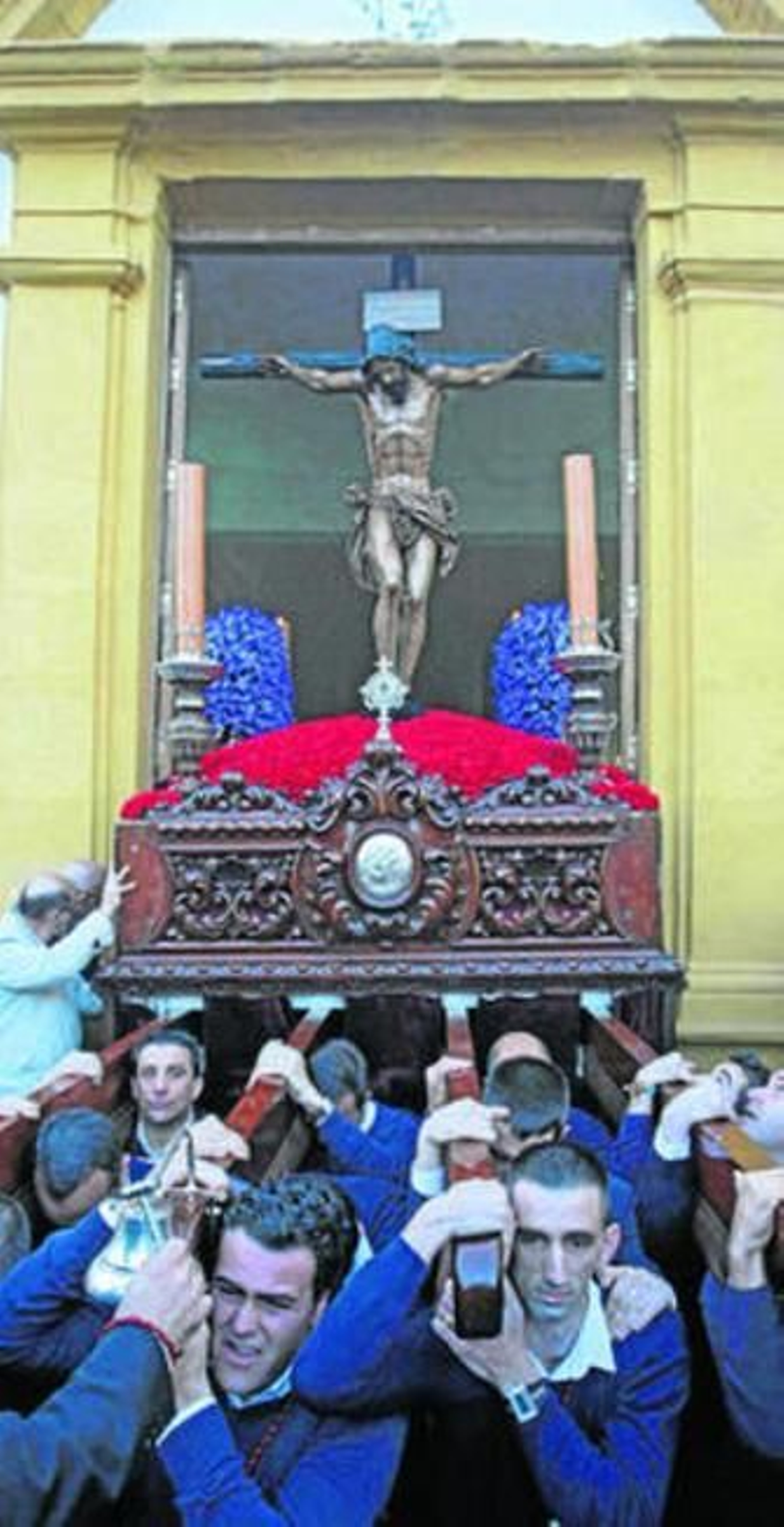 Difícil hacerse un hueco en la plaza Juan de Lima. La Venerable Archicofradía de Nuestra Señora del Carmen no estrenó nada pero la crisis es lo que tiene. Lo importante en los tiempos que corren es estar en la calle y que la fe y la oración hagan el resto. A las 20:15 horas se abrieron las puertas de La Caridad. Los cargadores atravesaron el dintel en una maniobra muy complicada y por ello recibieron el reconocimiento de los cientos de devotos expectantes ante la salida del Cristo primero y de Nuestra Señora del Mayor Dolor y San Juan Evangelista después.