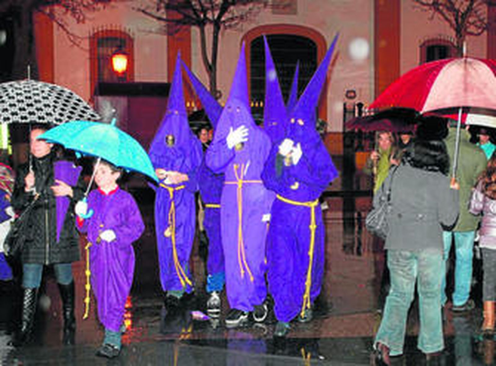 El hecho de la que el cortejo se organice y salga desde el santuario de la Inmaculada Concepción pero el paso del Gran Poder esté en la calle Méndez Núñez hizo que se viera un ir y venir constante de nazarenos bajo la lluvia desde la iglesia a la casa hermandad y al contrario.